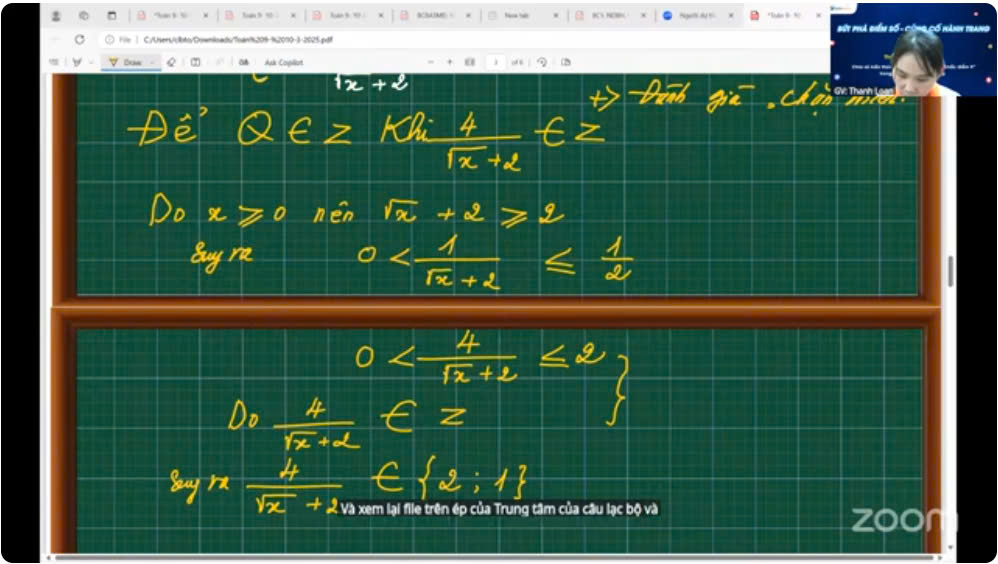 Trong buổi livestream, cô Loan đã cùng các bạn học sinh chinh phục những câu khó trong dạng bài rút gọn ở đề thi vào 10. Đó là bài toán liên quan đến tìm tất cả các giá trị của x để biểu thức (chứa căn) đạt giá trị nguyên, GTLN, GTNN. Cô Loan nhấn mạnh rằng với dạng toán này, các con sẽ thường nhầm lẫn giữa dạng toán tìm x nguyên để biểu thức đạt giá trị nguyên của chương trình lớp 7, lớp 8 tức biểu thức không chứa căn.