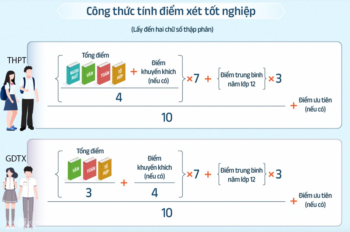 Cách tính điểm tốt nghiệp cho những thí sinh thuộc hệ GDTX cũng tương tự như thế. Những thí sinh này cần thực hiện 3 bài thi. Trong đó gồm có 2 bài thi độc là chính là Toán và Ngữ văn cùng với một trong 2 bài thi Khoa học Xã hội và Khoa học Tự nhiên tự chọn.