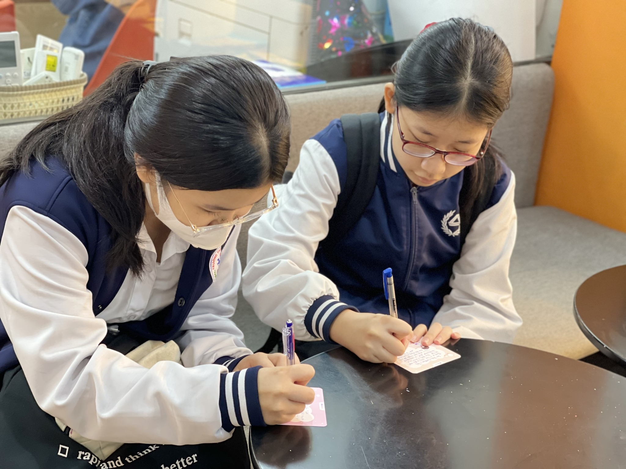 Các bạn học sinh tại Láng Hạ đang tranh thủ giờ nghỉ giải lao để viết những tấm thiệp 20/11