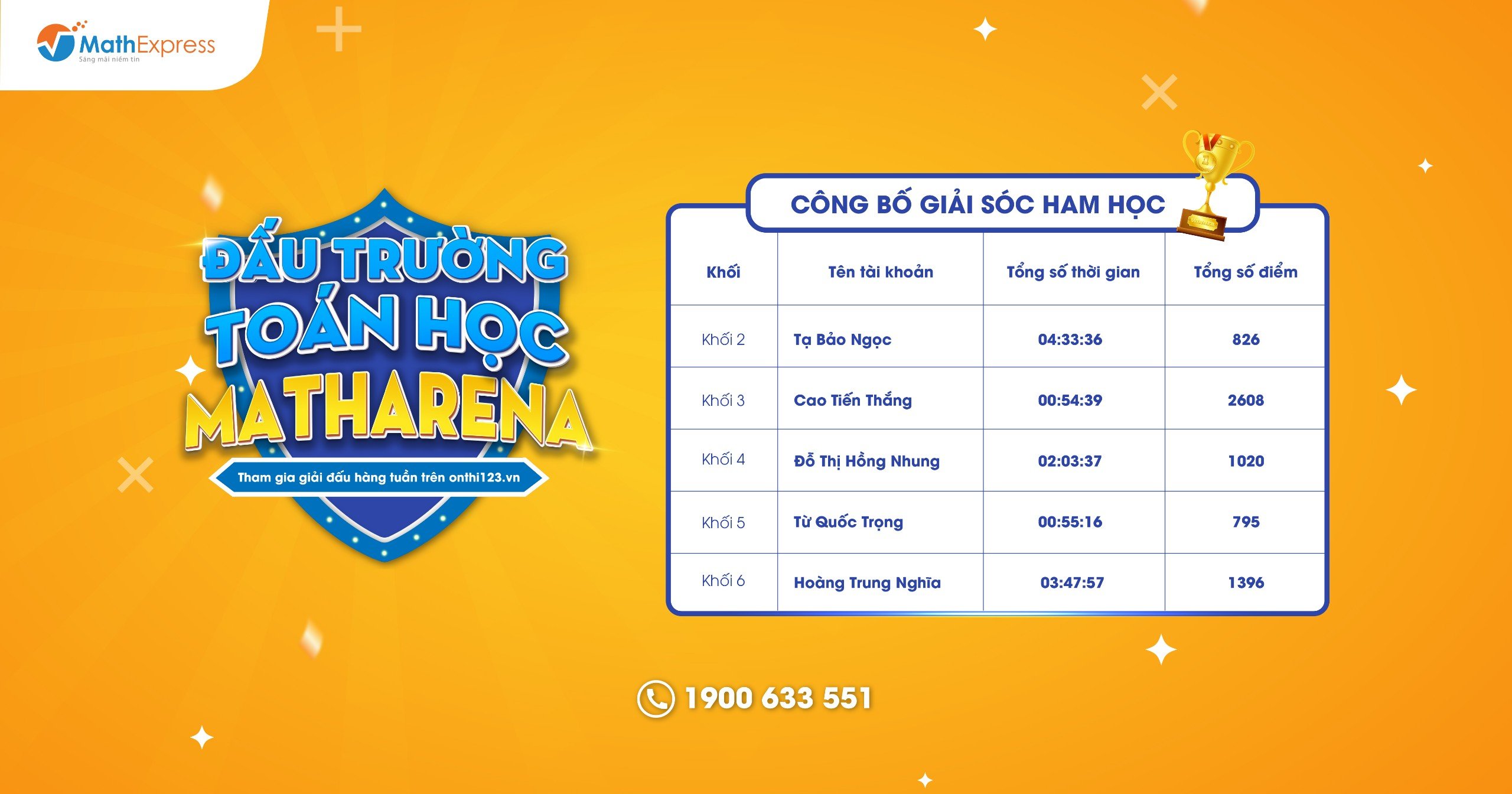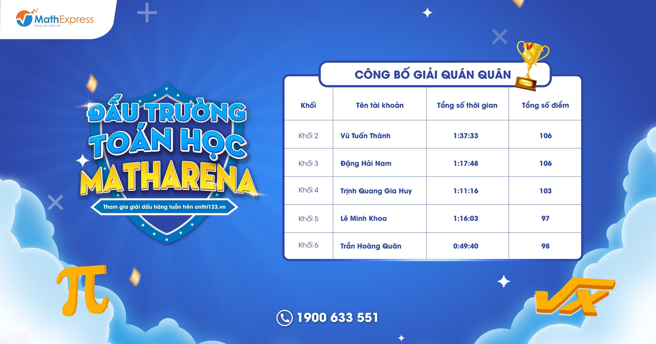 MathExpress sẽ sớm liên hệ với Phụ huynh để xác nhận thông tin và trao giải. Mọi thông tin chi tiết, Quý phụ huynh và các bạn học sinh vui lòng liên hệ tổng đài 1900633551 hoặc Fanpage của CLB để được hỗ trợ. CLB xin chân thành cảm ơn Phụ huynh và các em học sinh đã dành sự quan tâm tới đấu trường Toán học – MathArena và hy vọng chúng tôi sẽ tiếp tục nhận được sự ủng hộ từ Phụ huynh và các em trong những cuộc thi tiếp theo.