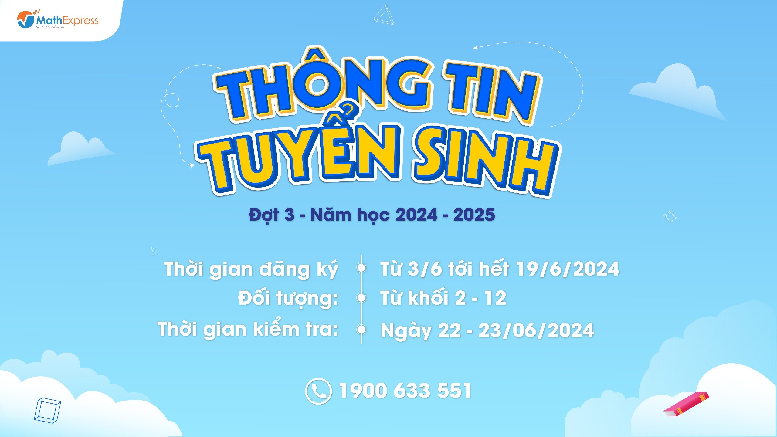 Như đã được thông tin trên các phương tiện truyền thông của MathExpress, thời gian đăng ký tuyển sinh đầu vào đợt 3 diễn ra từ ngày 3/6 tới hết ngày 19/6/2024. Thời gian tổ chức thi kiểm tra xếp lớp đầu vào đợt 3 diễn ra trong 2 ngày 22-23/06/2024. Cụ thể như sau: