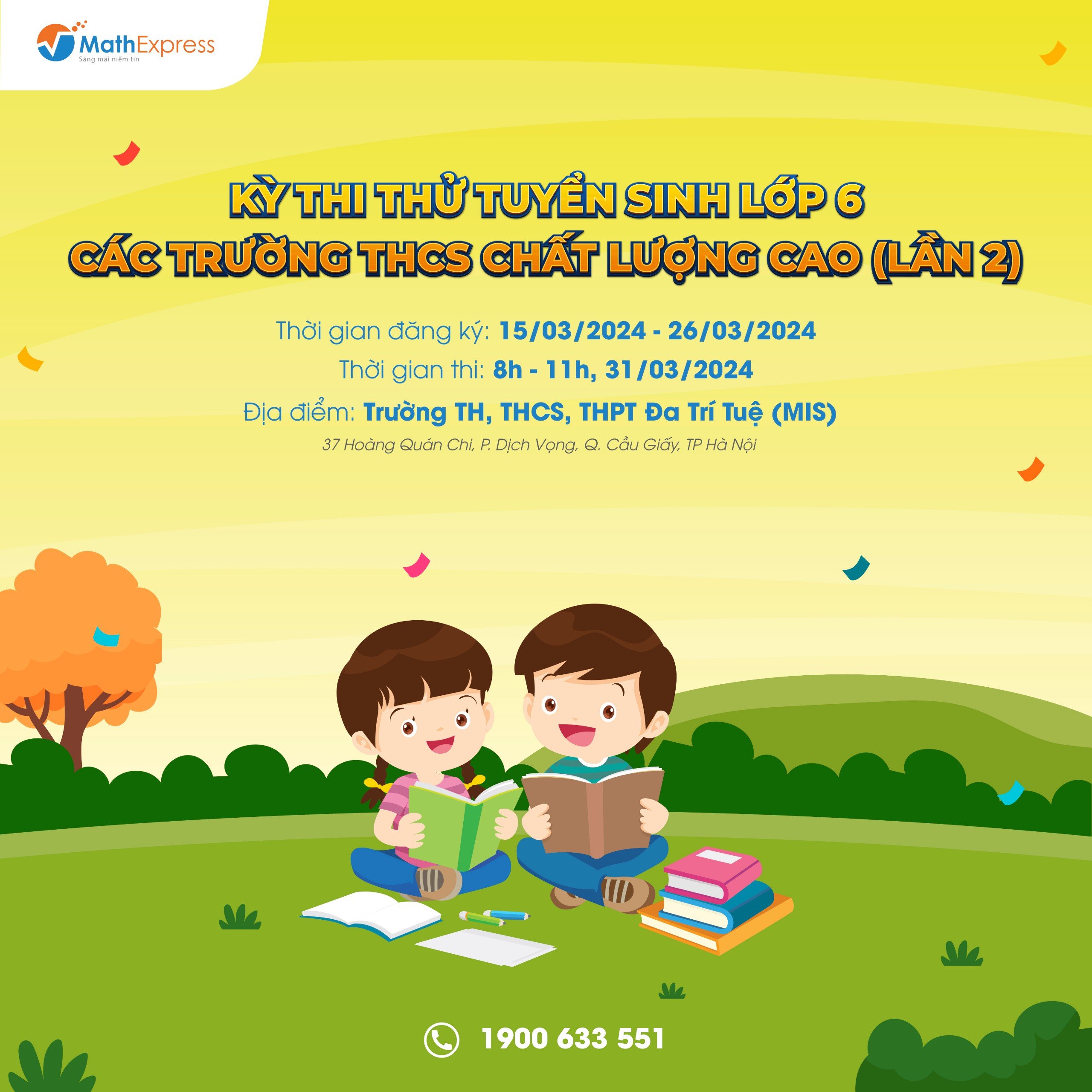 Tiếp nối thành công của kỳ thi thử lần 1 với hơn 800 học sinh tham gia và nhằm giúp các em lớp 5 có cơ hội thử sức và rèn luyện kỹ năng làm bài trong phòng thi để chuẩn bị tốt hơn trong giai đoạn chạy đua nước rút tới kỳ thi chuyển cấp chính thức,  MathExpress sẽ tổ chức kỳ thi thử tuyển sinh lớp 6 các trường THCS Chất Lượng Cao lần 2 vào 31/03 này. Thông tin chi tiết về kỳ thi, phụ huynh và các em học sinh vui lòng tham khảo trong bài viết dưới đây.