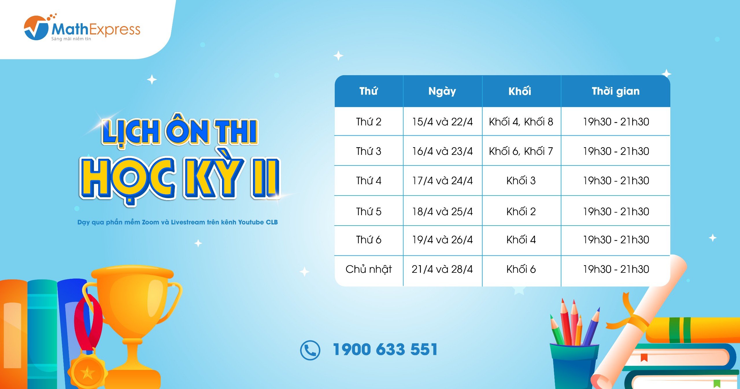 MathExpress xin thông báo CLB mở lớp ôn thi học kỳ II môn Toán miễn phí dành cho các khối 2, 3, 4, 6, 7, 8 nhằm giúp các em học sinh củng cố lại kiến thức đã học để vững bước trước kỳ thi cuối học kỳ. Để xem lịch học và các thông tin khác, các bậc phụ huynh và các em học sinh cùng tham khảo bài viết sau đây.