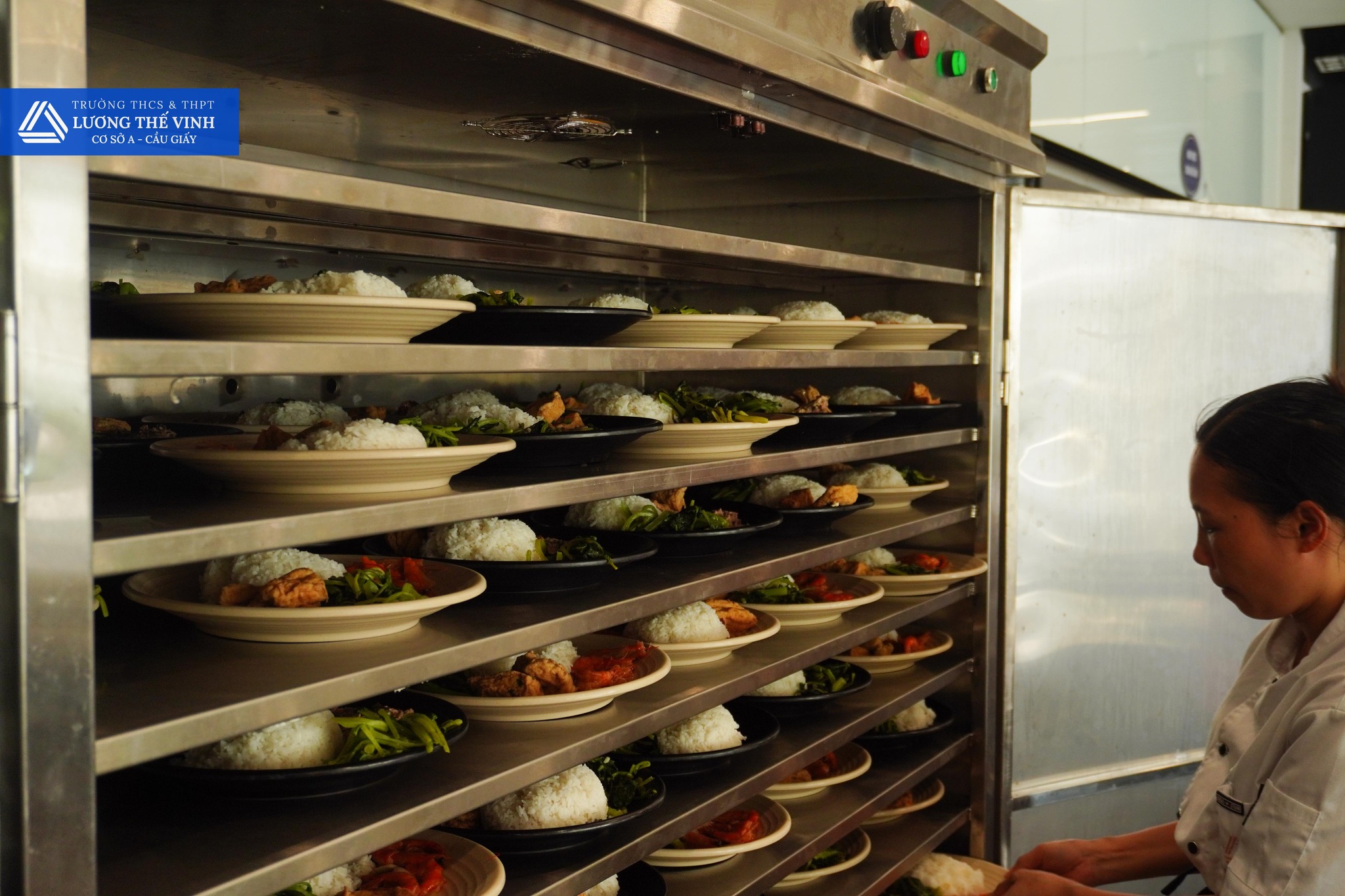 Về cơ sở vật chất của trường cũng được đầu tư rất khang trang với các tòa nhà cao tầng hiện đại. Hệ thống các lớp học được trang bị đầy đủ các thiết bị học tập cần thiết như máy chiếu, loa, quạt, điều hòa,… Ngoài các lớp học chính còn có khu giáo dục thể chất, phòng thư viện, phòng y tế, phòng máy tính,… Sân trường rộng rãi thoáng mát, nhiều cây xanh cũng tạo nên môi trường học tập vui chơi thoải mái, đảm bảo tiêu chí xanh – sạch – đẹp – an toàn cho các em học sinh. Các học sinh được tổ chức ăn trưa tại trường và thực đơn được lên lịch theo tuần để cha mẹ và các em học sinh tiện theo dõi. Đặc biệt, THPT Lương Thế Vinh có khu nhà ăn là niềm “mơ ước” với nhiều bạn học sinh. Bếp ăn của trường có công suất phục vụ lên tới 1250 suất ăn, các khâu đều được tính toán cẩn thận sao cho suất ăn đến được tay các bạn học sinh nhanh nhất. Để luôn đảm bảo được chất lượng của bữa ăn, các cô chú còn bảo quản thực phẩm bằng lò giữ ấm phòng khi có bạn nào “hơi mải chơi” mà xuống muộn nữa.