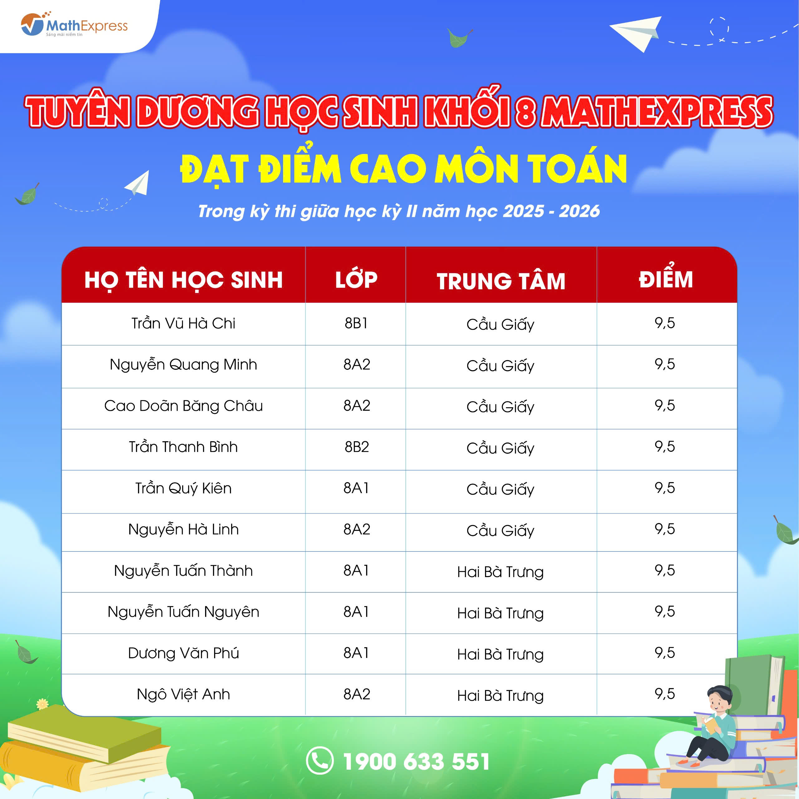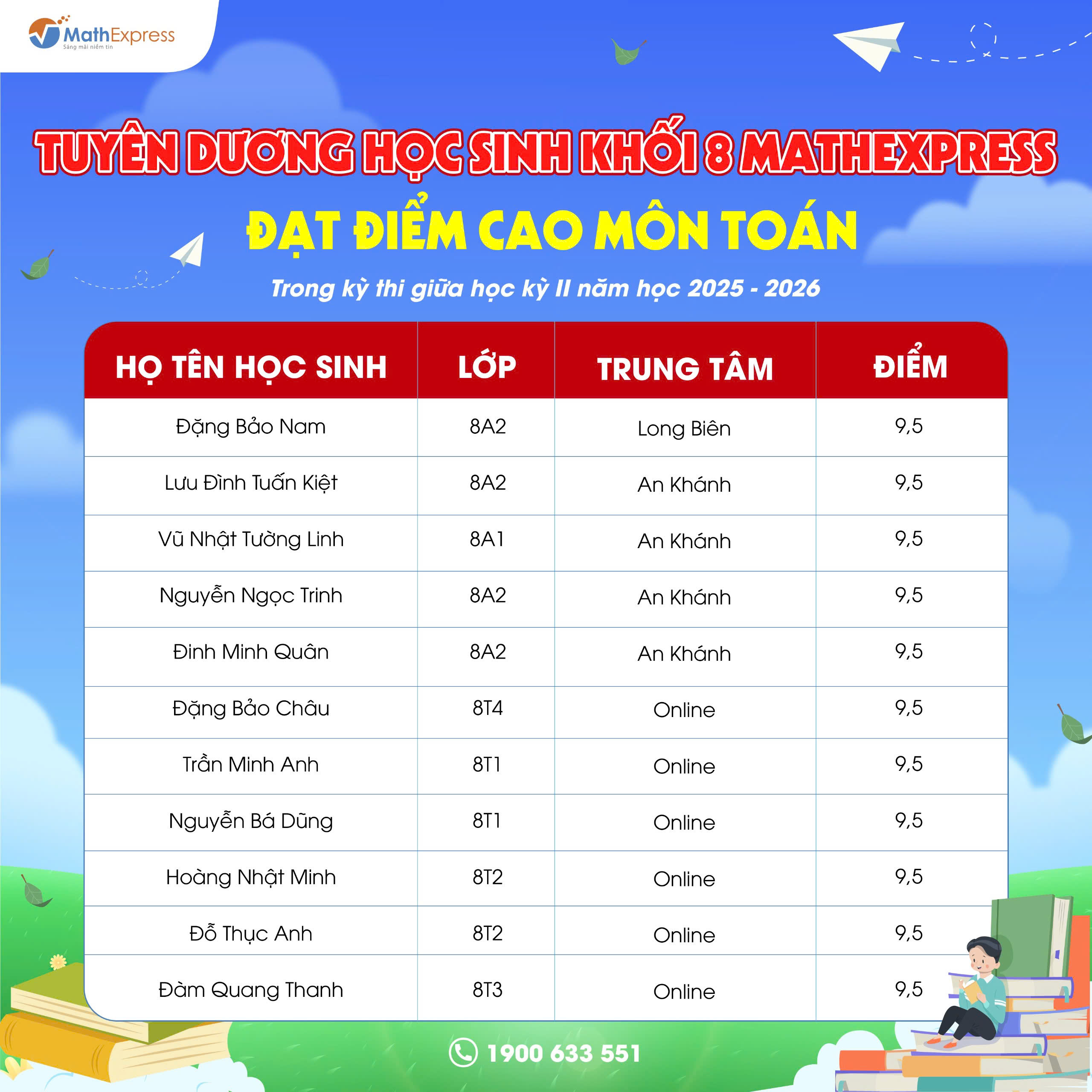 Danh sách học sinh khối 8 đạt điểm cao môn Toán trong kỳ thi giữa học kỳ II vừa qua đã được MathExpress tổng hợp đến ngày 31/03/2026 trong các hình ảnh dưới đây. Mời Quý Phụ huynh cùng các em học sinh theo dõi.