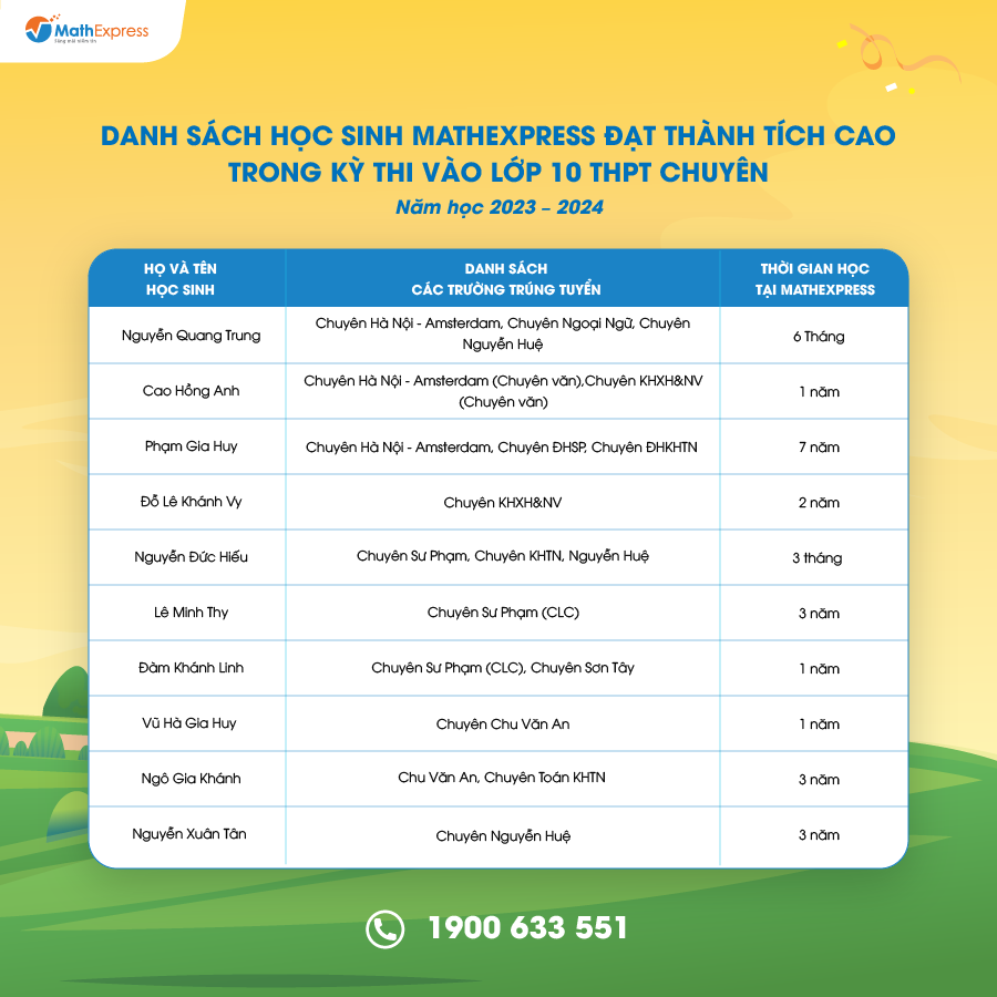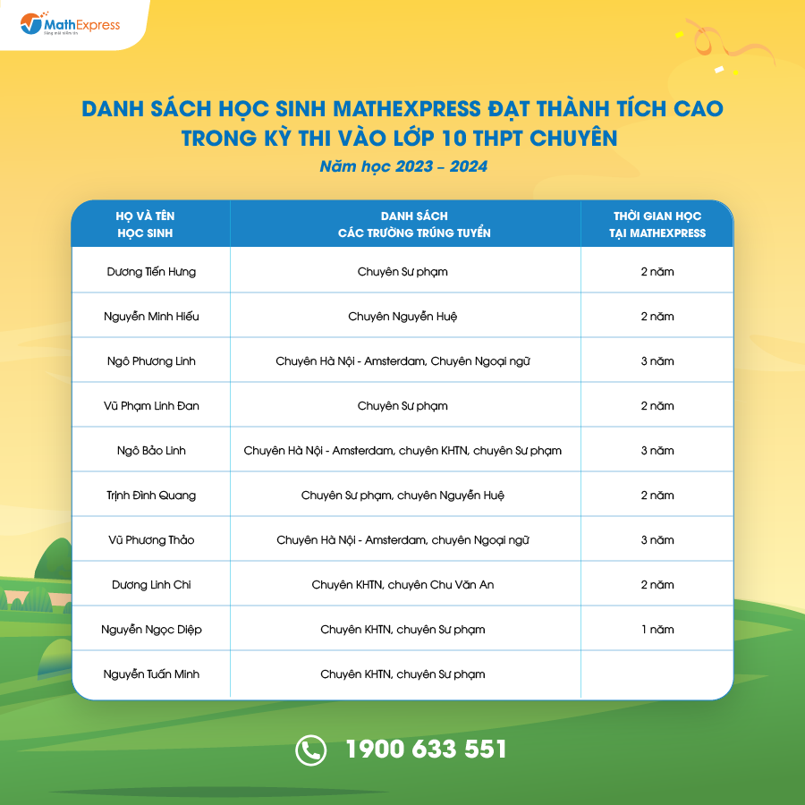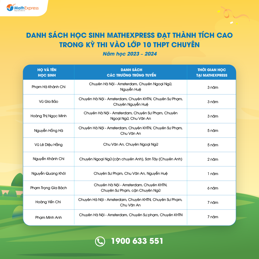 Lại một mùa tuyển sinh THPT chuyên nữa qua đi, MathExpress nhận được rất nhiều thành tích cao từ các sĩ tử. Dưới đây là tổng kết một số kết quả thi vào lớp 10 các trường THPT chuyên của học sinh tại CLB MathExpress năm học 2023 – 2024