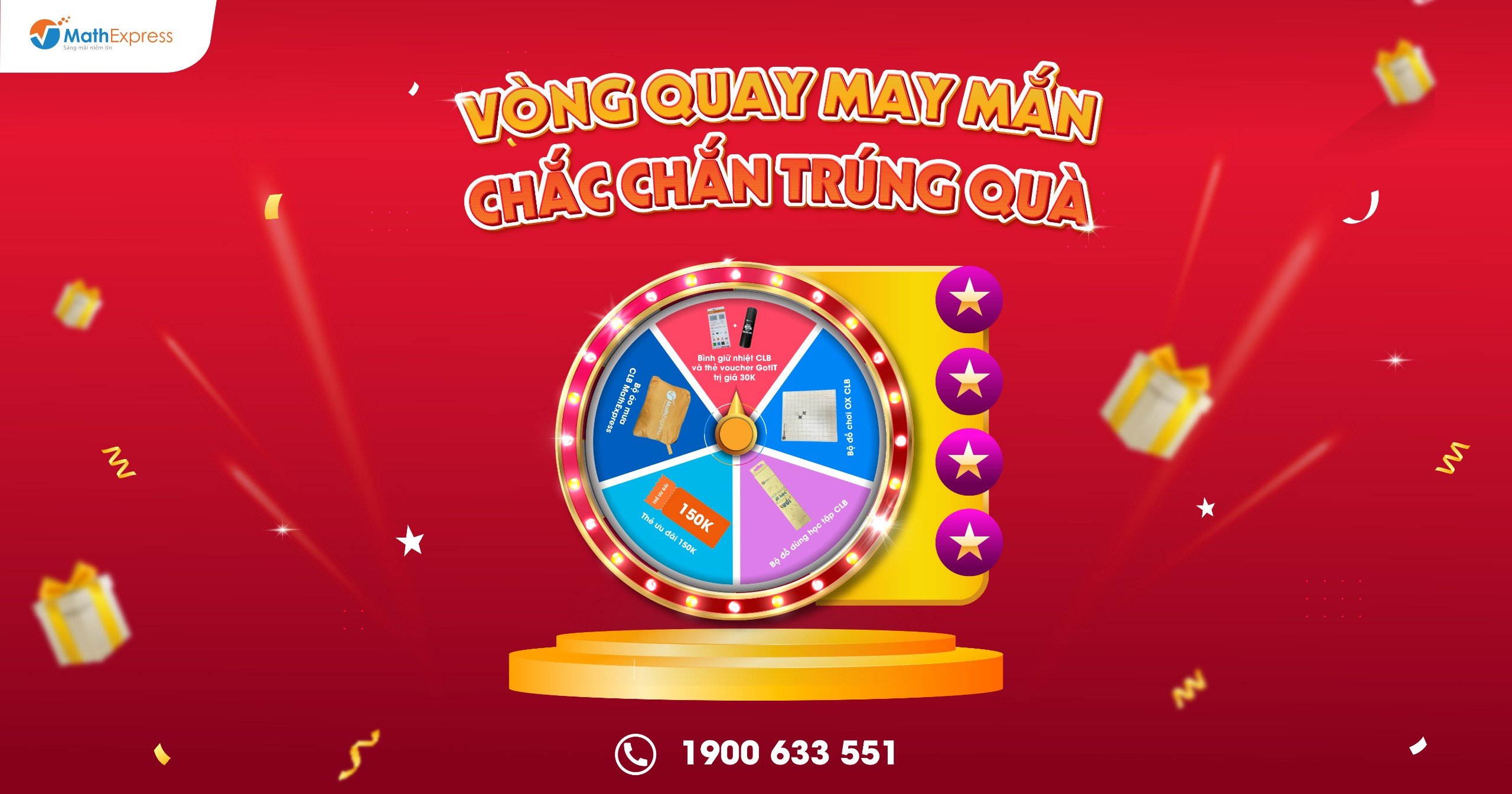 Trong trường hợp cần hỗ trợ thông tin, Quý Phụ huynh vui lòng liên hệ tổng đài 1900633551 hoặc nhắn tin tới fanpage CLB Toán bồi dưỡng – MathExpress để được giải đáp. MathExpress chúc các bậc phụ huynh và các em học sinh sẽ có thật nhiều niềm vui và nhận được ring được quà to về khi tham gia Minigame “Vòng quay may mắn – Chắc chắn trúng quà.