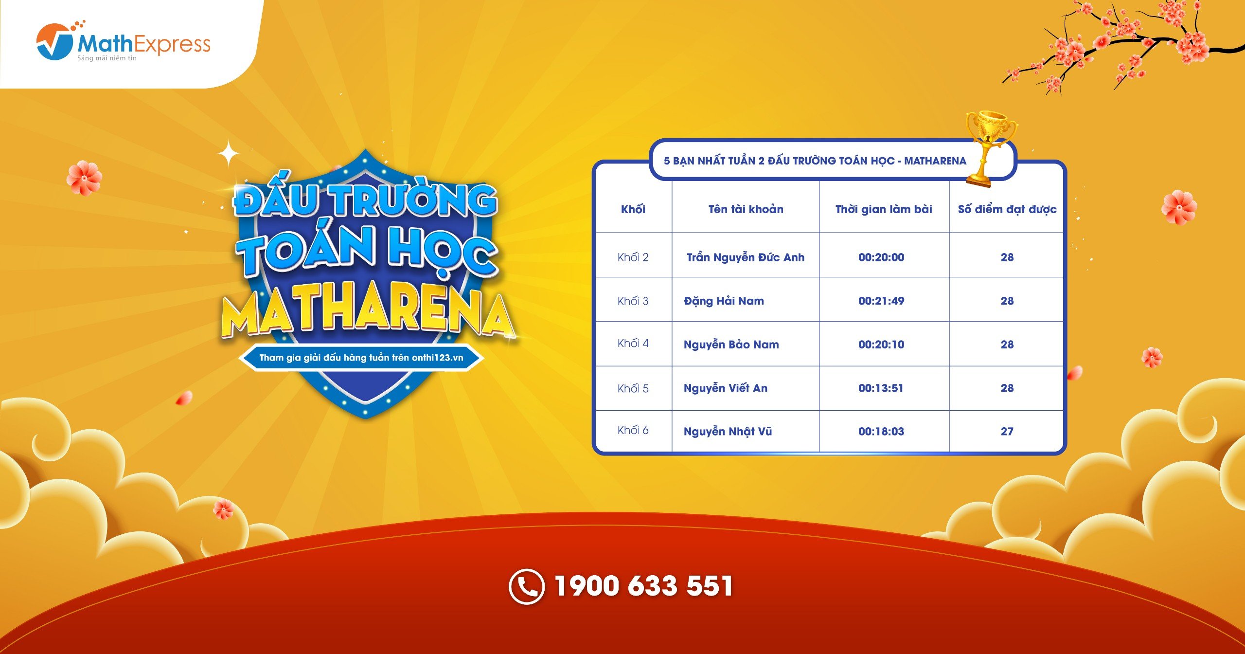 Nếu cần hỗ trợ, Quý Phụ huynh vui lòng liên hệ tổng đài 1900 633 551 hoặc nhắn tin tới fanpage CLB Toán bồi dưỡng – MathExpress. CLB xin chân thành cảm ơn.