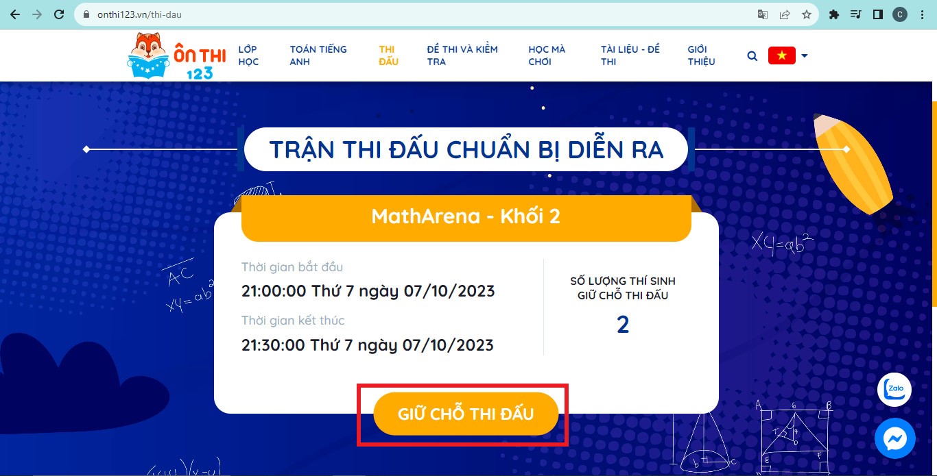 Trên đây là hướng dẫn sử dụng tính năng “Thi đấu” trên Onthi123.vn để dự thi Đấu trường toán học – MATHARENA do MathExpress tổ chức. Nếu có thắc mắc, Quý Phụ huynh và các bạn học sinh vui lòng liên hệ tổng đài 1900 633 551 hoặc gửi tin nhắn đến fanpage CLB Toán bồi dưỡng – MathExpress để được hỗ trợ.