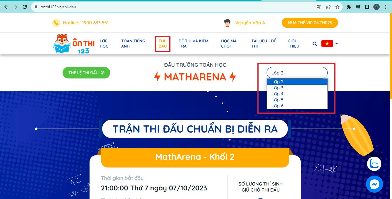 Bước 2: Trước giờ thi khoảng 10 phút, thí sinh cần truy cập onthi123.vn và đăng nhập vào hệ thống. Tại trang chủ, chọn Thi đấu. Sau đó lựa chọn khối lớp dự thi. Học sinh cần đặc biệt lưu ý bước này để tránh làm nhầm bài thi của khối lớp khác dẫn đến việc kết quả thi không được công nhận.
