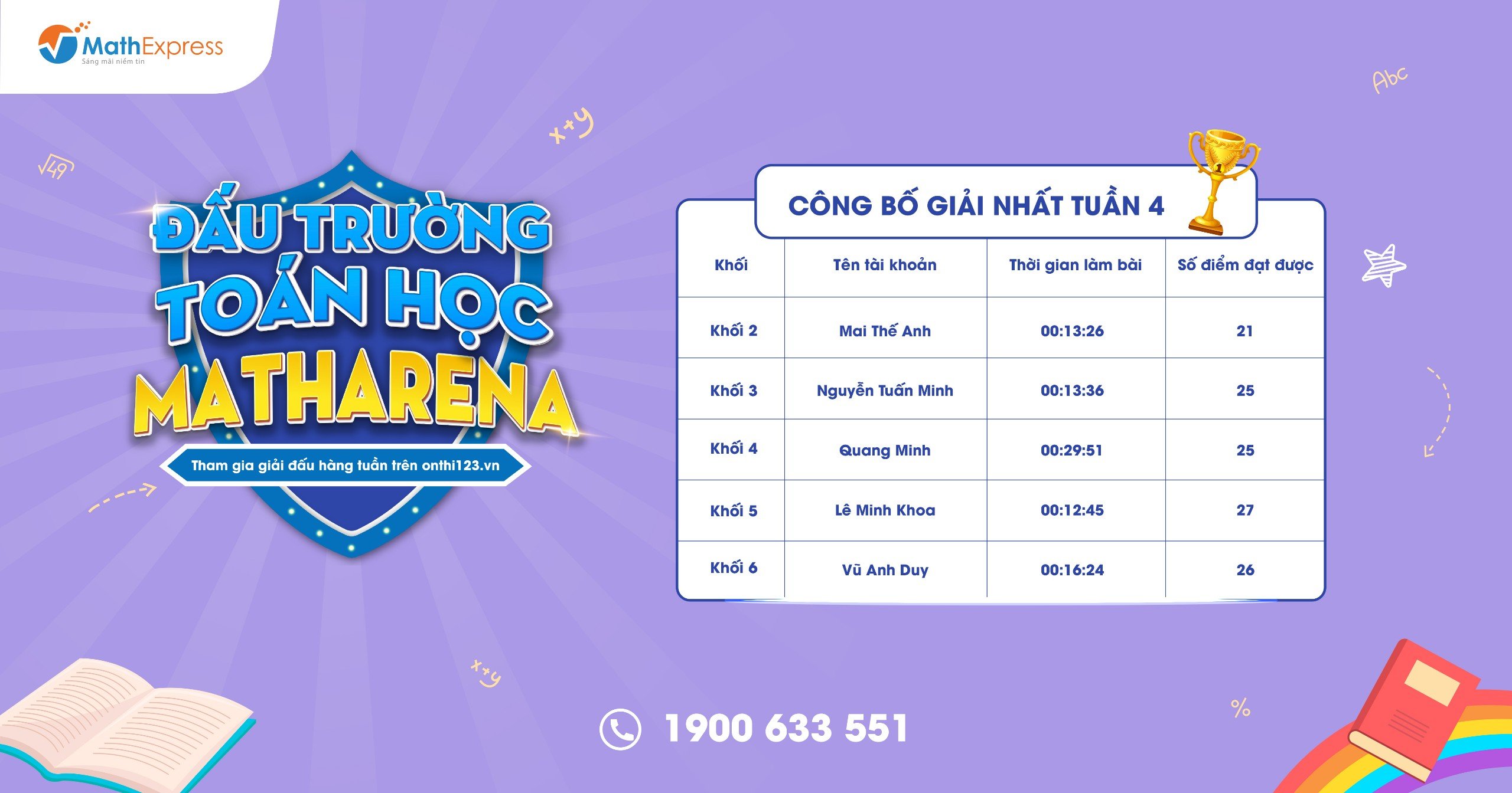 MathExpress dự kiến sẽ gửi kết quả tới các bậc phụ huynh và các em học sinh trên các kênh truyền thông của CLB vào ngày mai. Mọi thông tin chi tiết, Quý phụ huynh và các bạn học sinh vui lòng liên hệ tổng đài 1900633551 hoặc Fanpage của CLB Toán bồi dưỡng – MathExpress để được hỗ trợ.