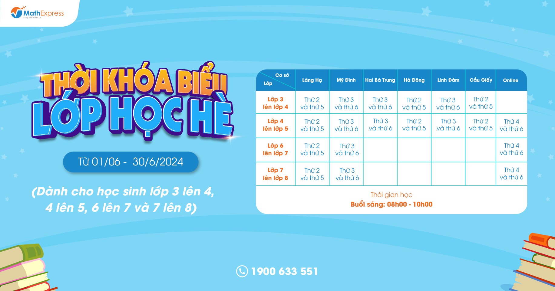 Nhằm hỗ trợ các em học sinh ôn tập kiến thức và hành trang vững chắc cho năm học mới 2024 – 2025, CLB Toán bồi dưỡng – MathExpress tổ chức các lớp học hè online và offline dành cho các em học sinh lớp 3 lên 4, 4 lên 5, 6 lên 7 và 7 lên 8 vào tháng 6 tới. Để xem thông tin chi tiết lịch học, thời gian học và đăng ký cho con tham gia, các bậc phụ huynh vui lòng tham khảo bài viết sau đây.