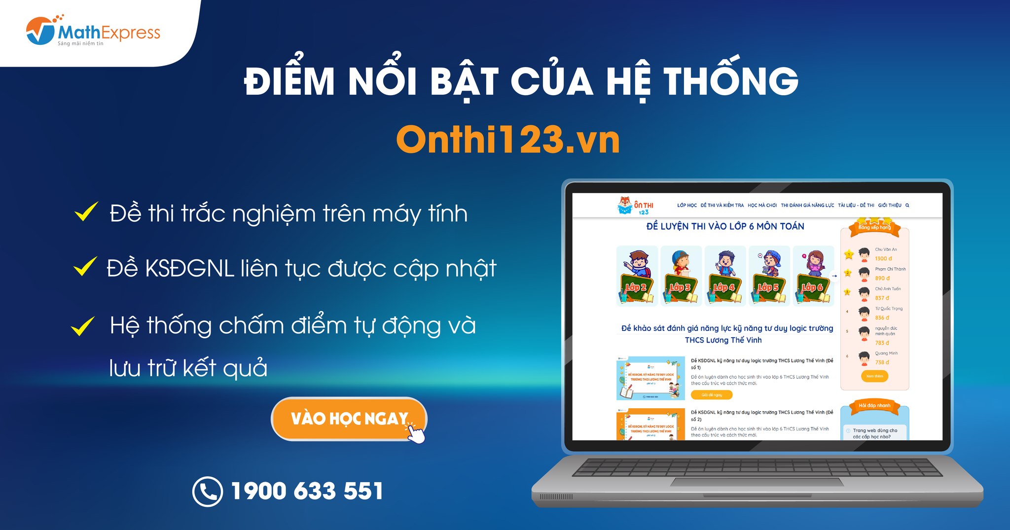 Onthi123 là hệ thống học trực tuyến do chính Thầy Trần Nhật Minh và đội ngũ giáo viên MathExpress xây dựng nội dung nhằm mang đến cho học sinh những giải pháp học tập toàn diện, hiệu quả. Một số điểm nổi bật của hệ thống Onthi123 phải kể đến:
