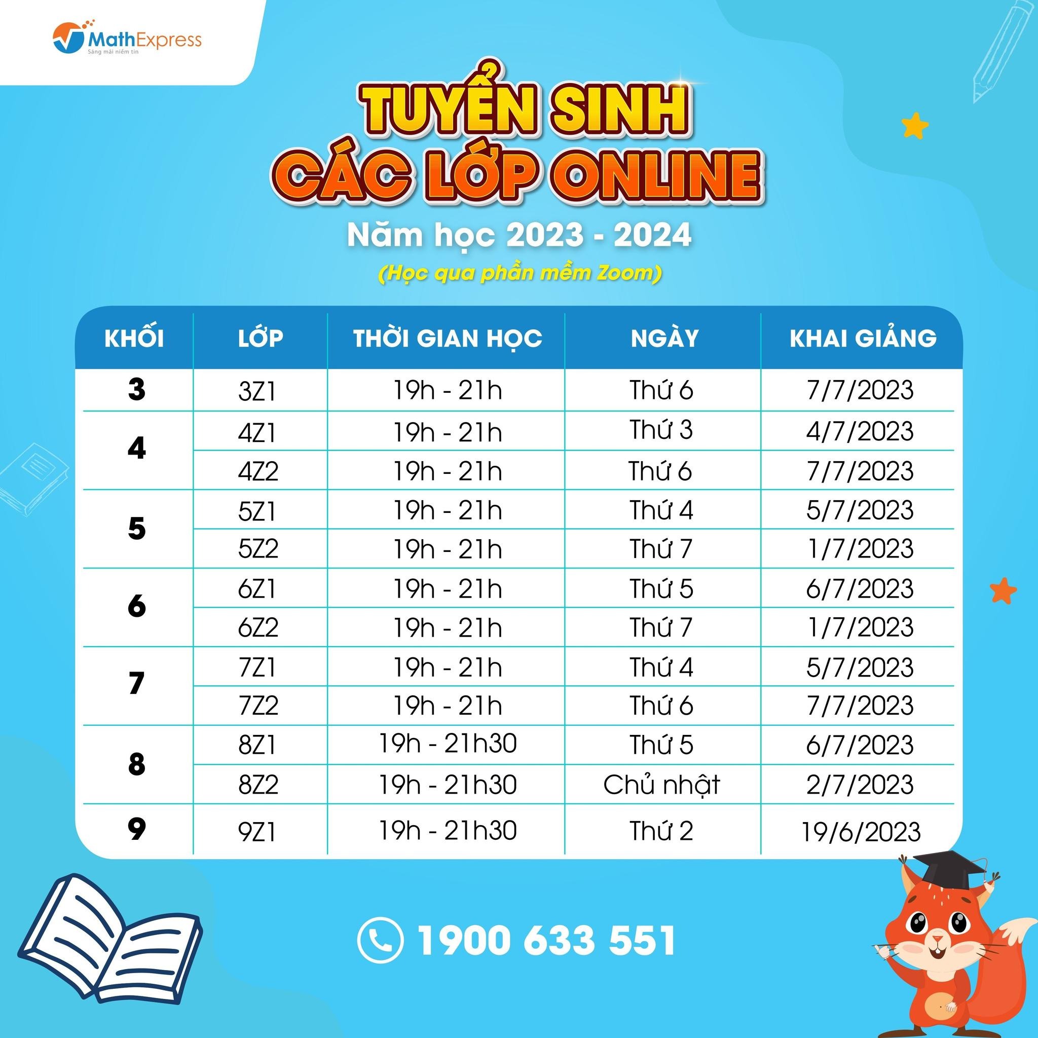 Trong năm học 2023 – 2024 này, MathExpress tổ chức 12 lớp Zoom dành cho học sinh các khối lớp từ 3 đến 9. Thông tin về lớp học, lịch học và học phí, Quý Phụ huynh có thể xem tại đây: