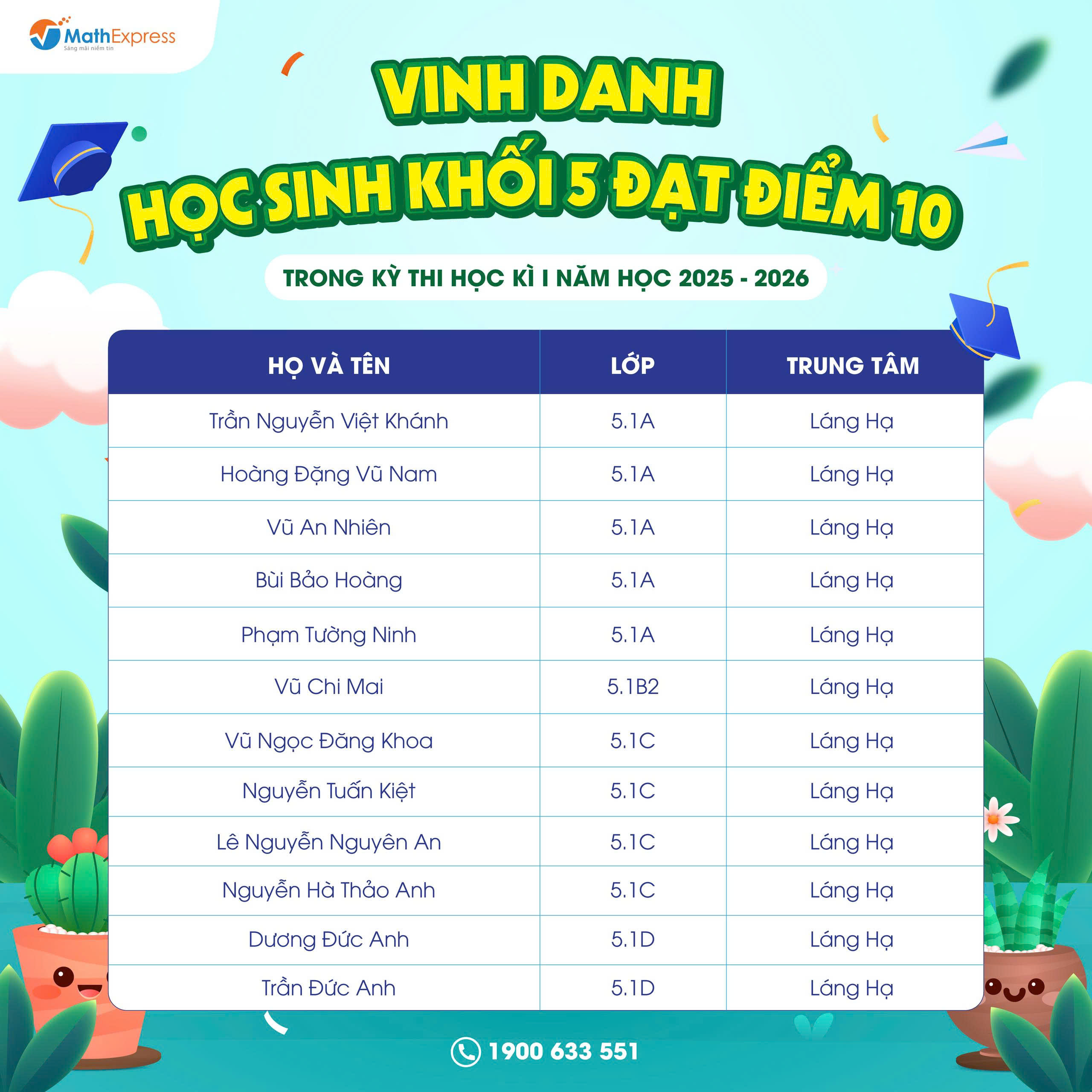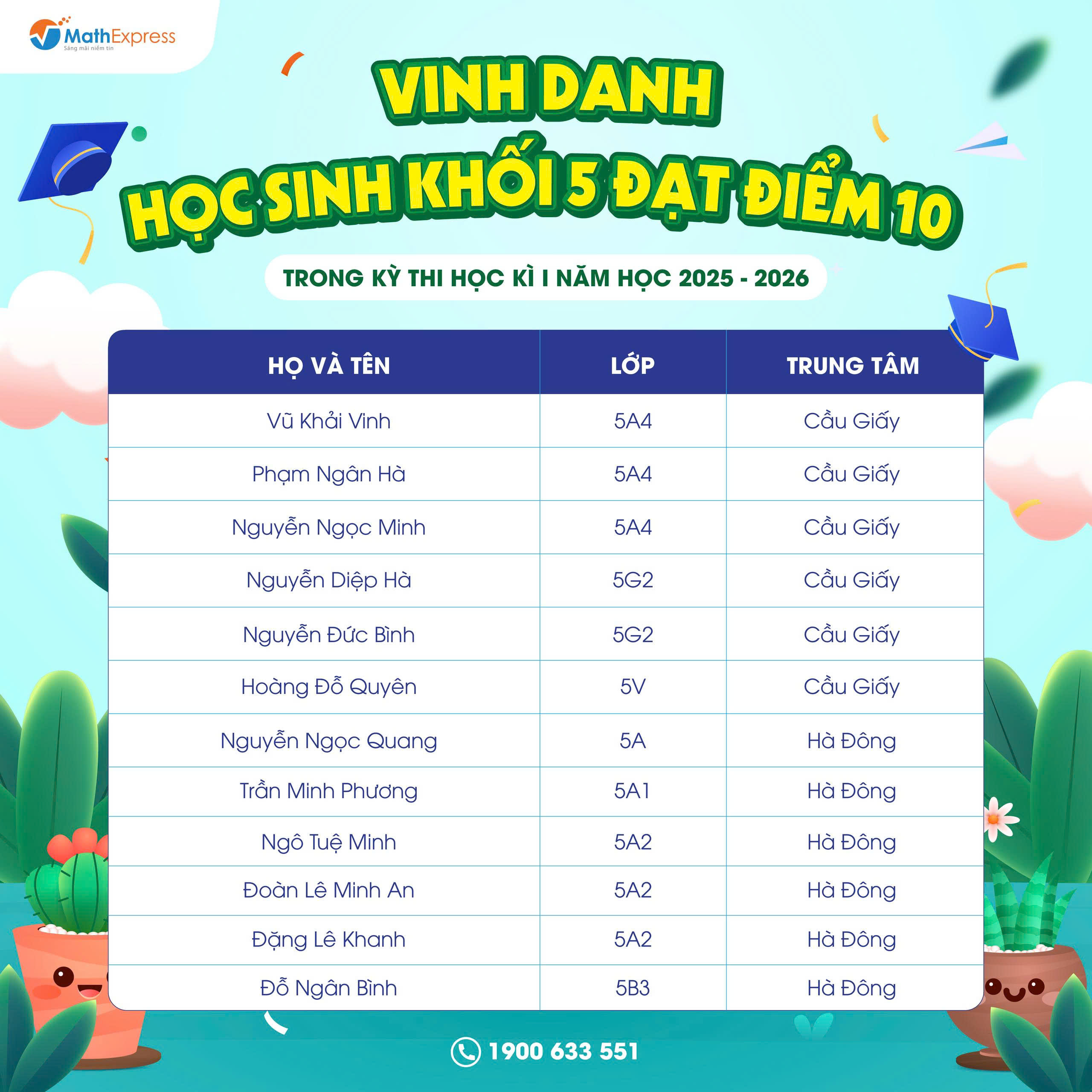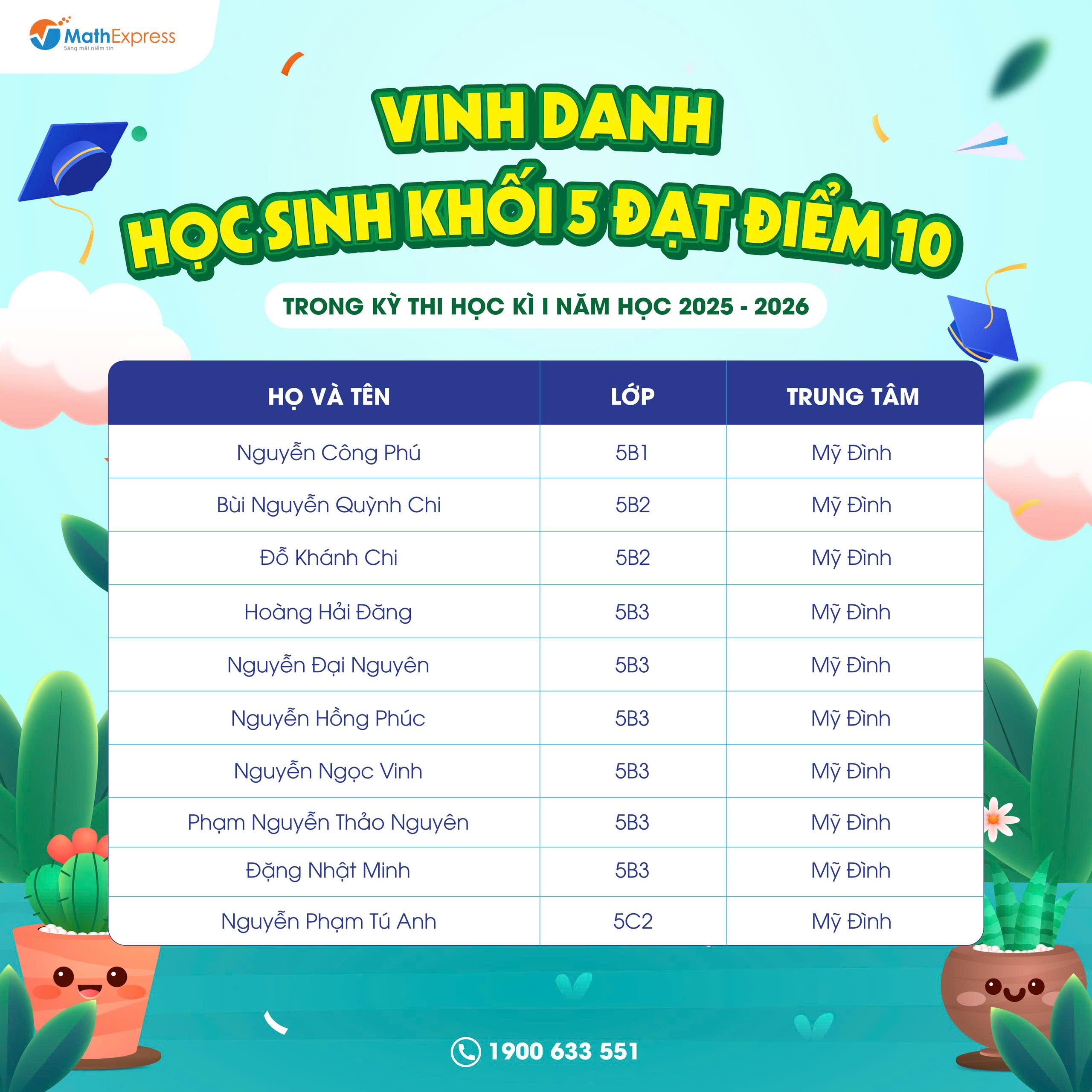 DANH SÁCH HỌC SINH KHỐI 5 MATHEXPRESS ĐẠT ĐIỂM 10 TRONG KỲ THI HỌC KỲ 1 NĂM HỌC 2025 – 2026
