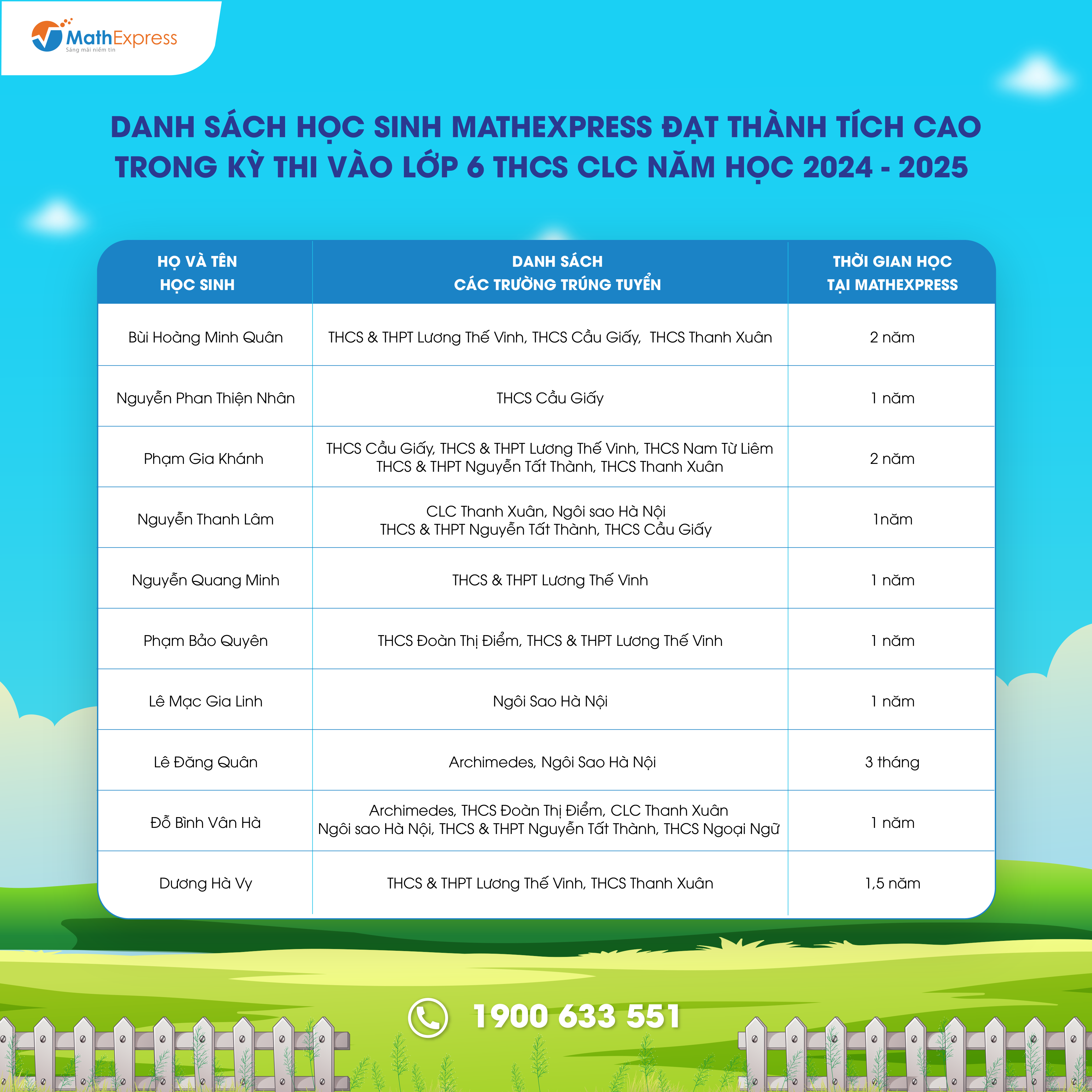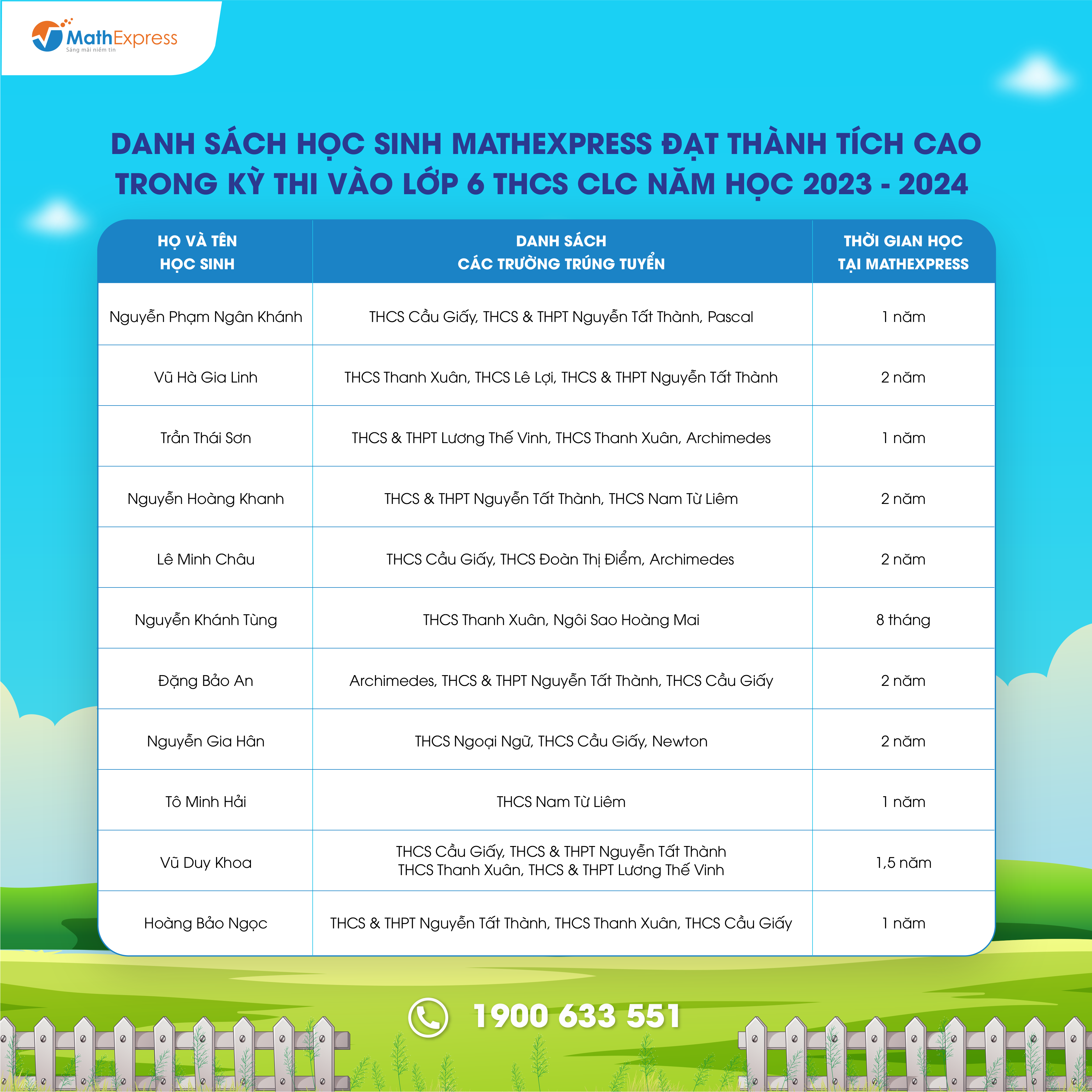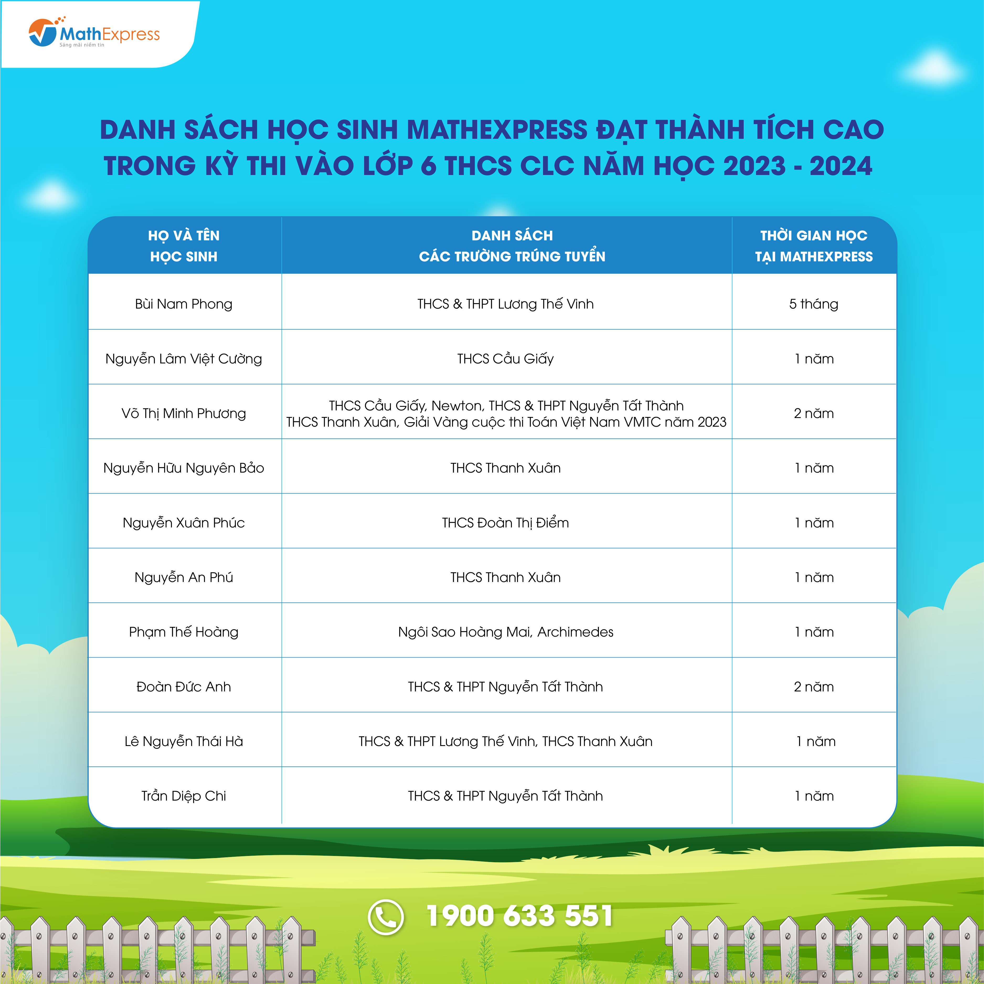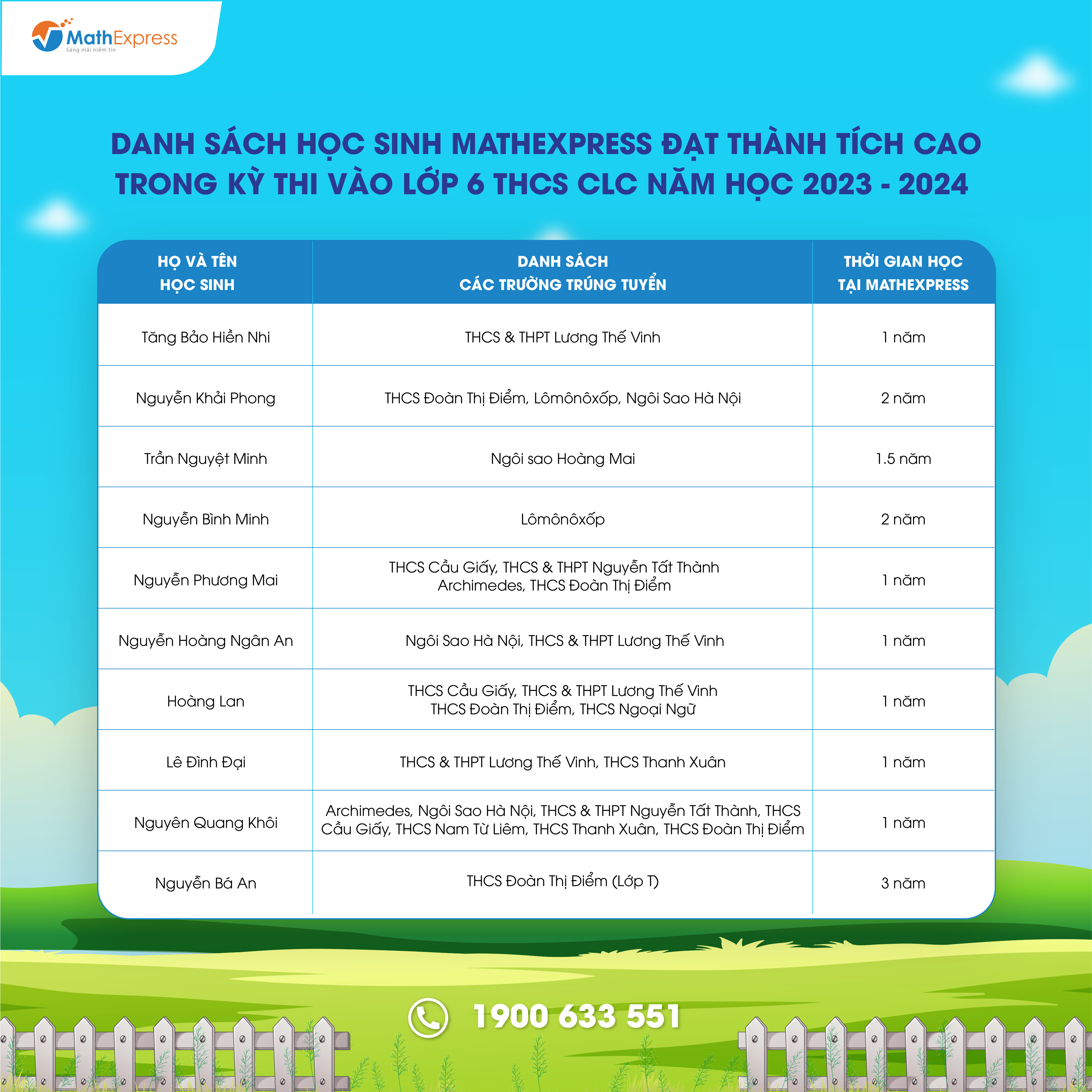 Việc tổng hợp danh sách với số lượng lớn sẽ khó tránh khỏi nhầm lẫn và thiếu sót. Trong trường hợp cần điều chỉnh và cập nhật thông tin, Phụ huynh vui lòng liên hệ tổng đài 1900633551 hoặc nhắn tin đến fanpage CLB Toán bồi dưỡng – MathExpress để được hỗ trợ.