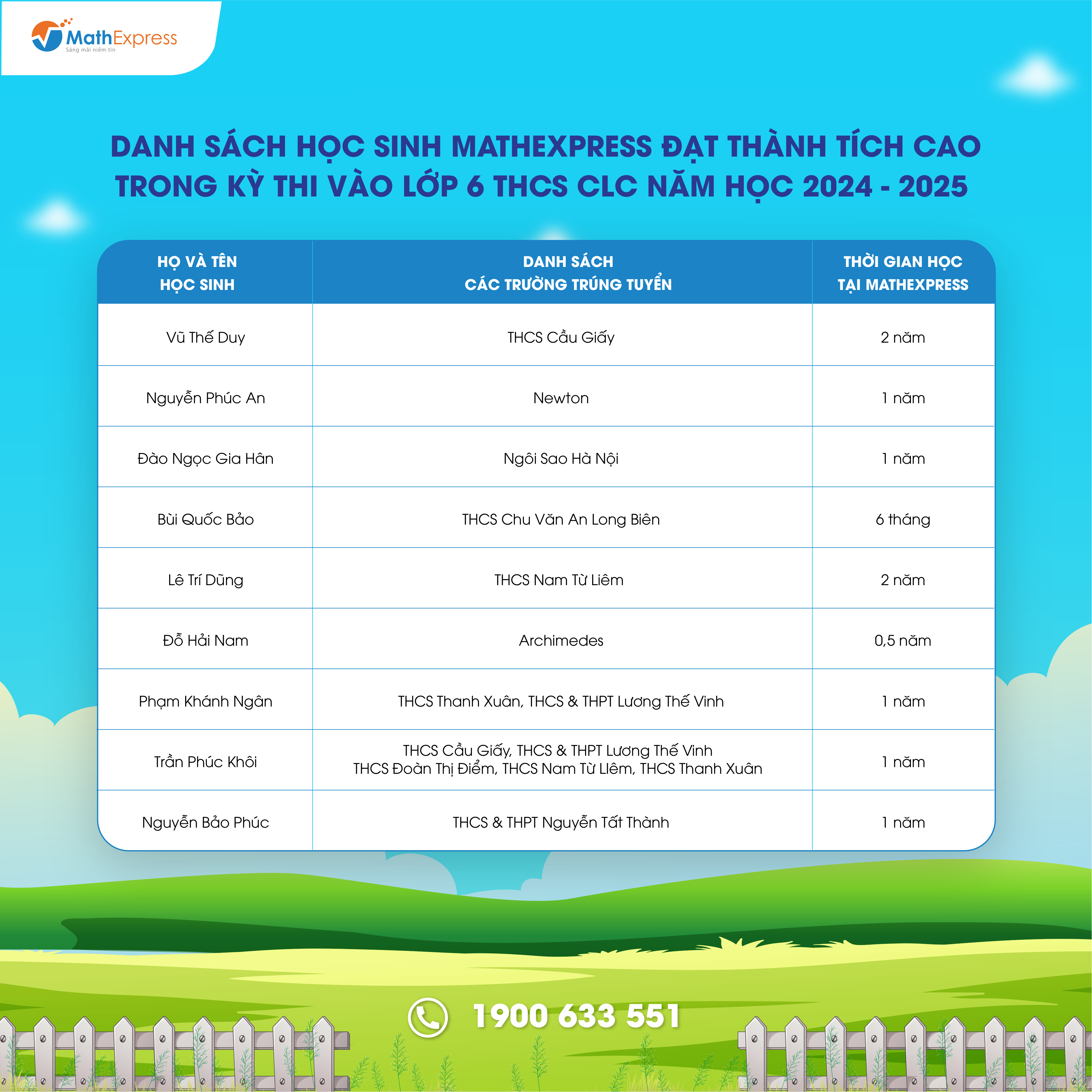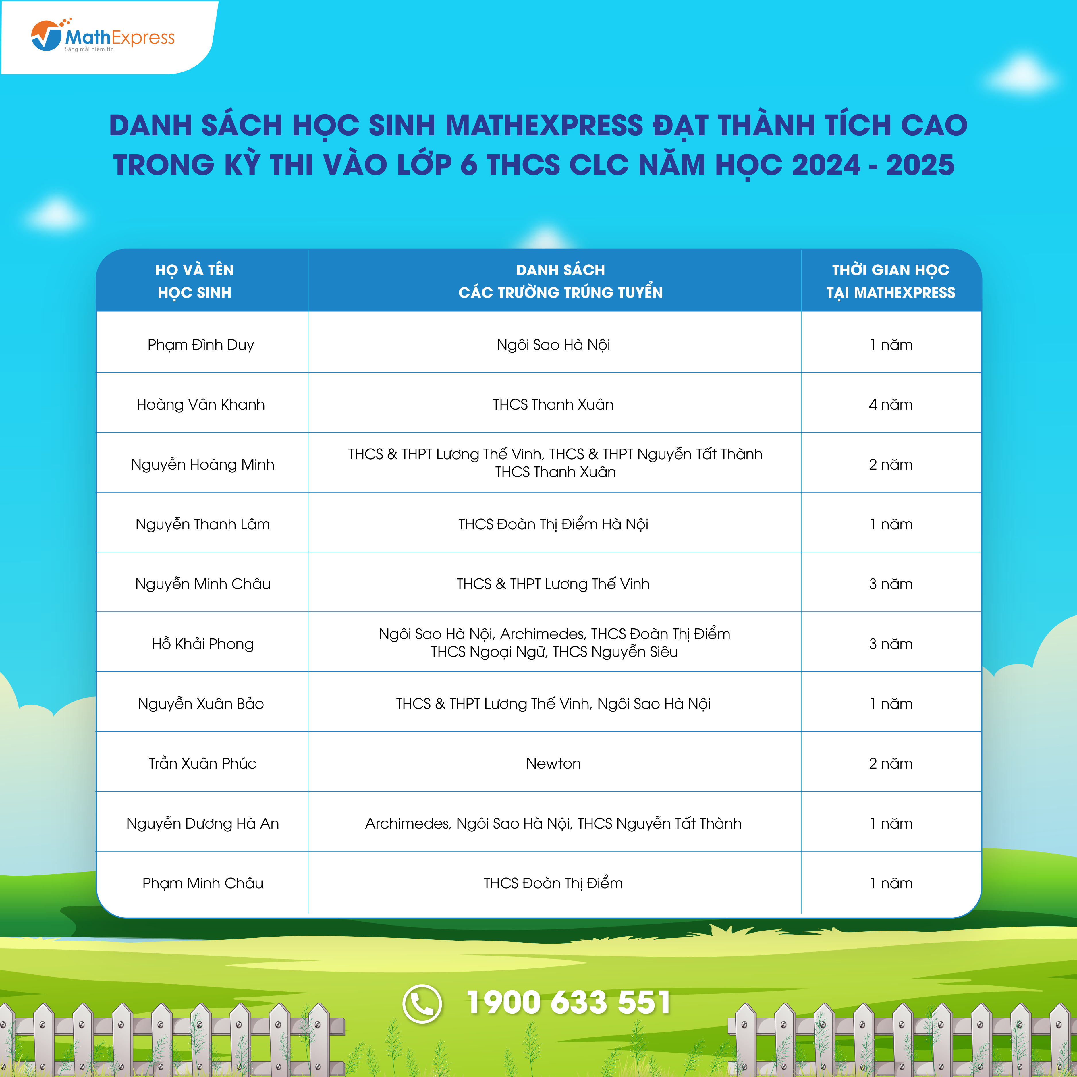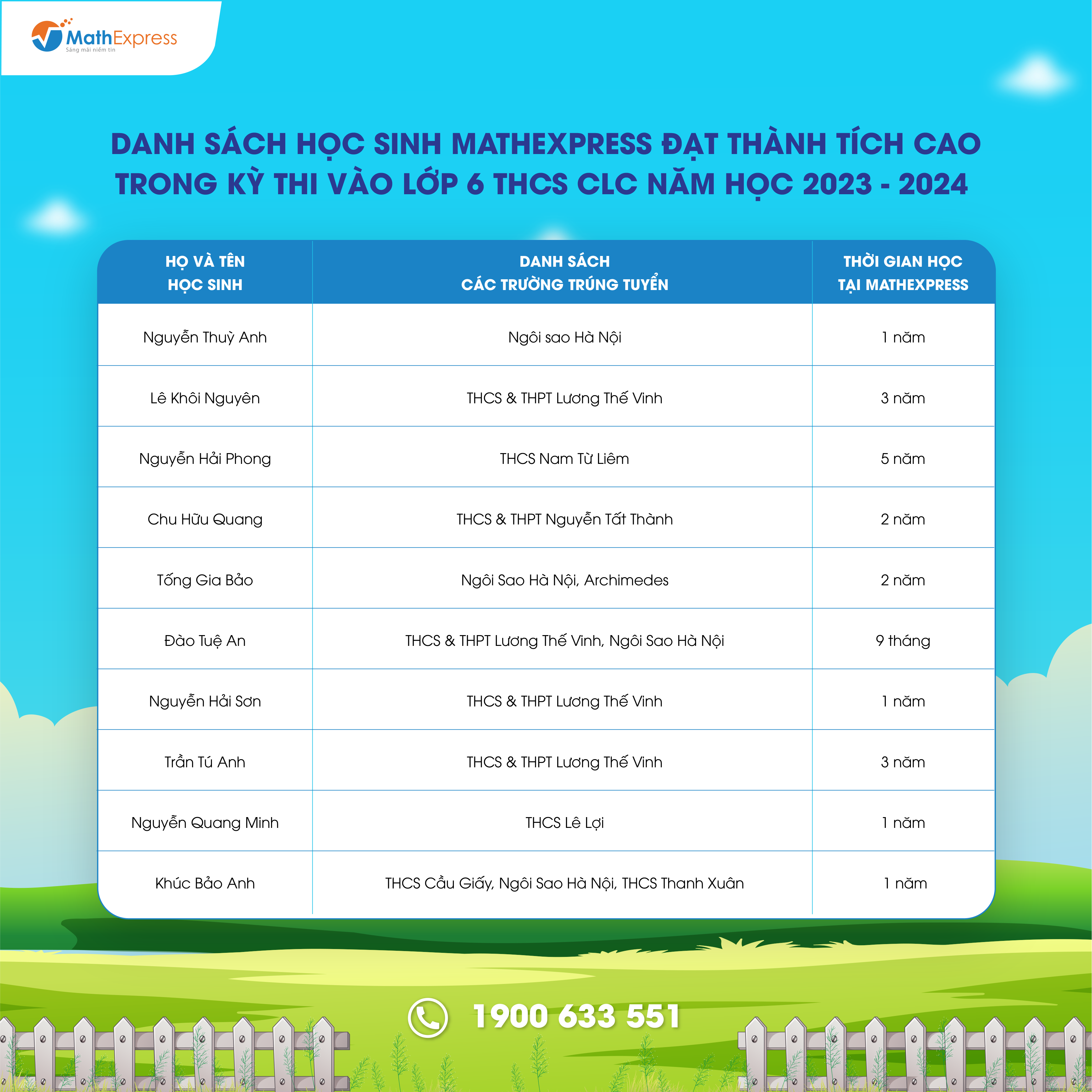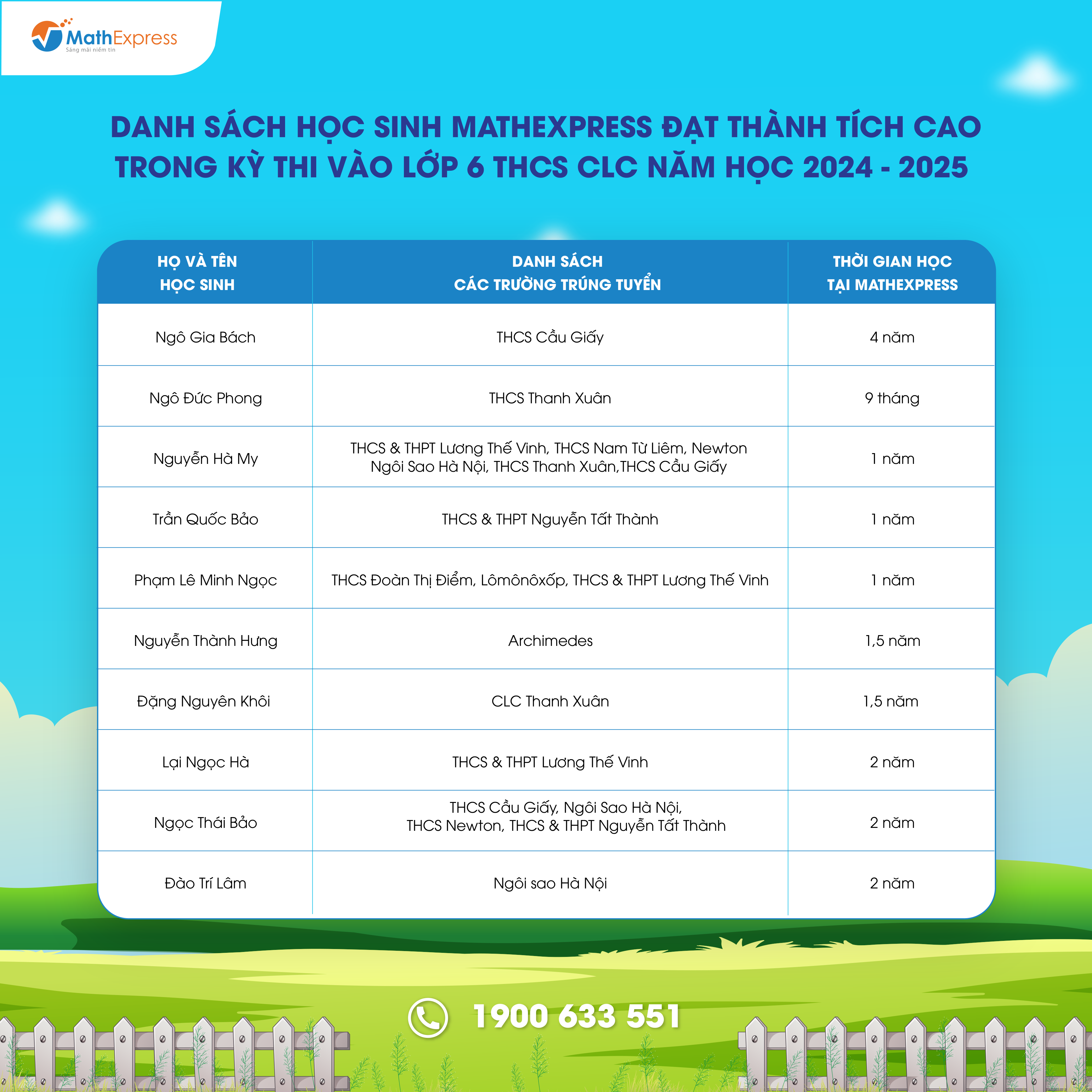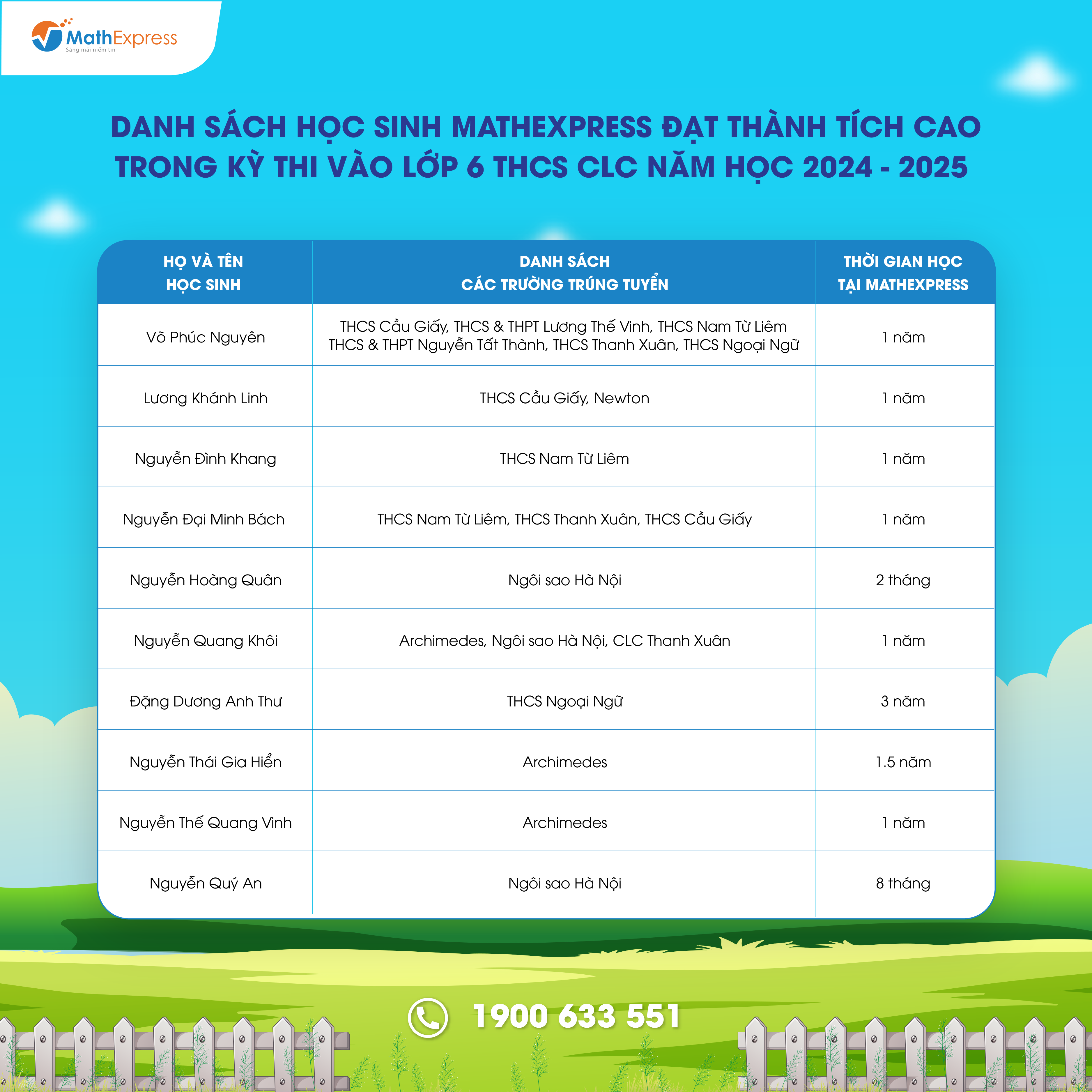 Việc tổng hợp danh sách với số lượng lớn sẽ khó tránh khỏi nhầm lẫn và thiếu sót. Trong trường hợp cần điều chỉnh và cập nhật thông tin, Phụ huynh vui lòng liên hệ tổng đài 1900633551 hoặc nhắn tin đến fanpage CLB Toán bồi dưỡng – MathExpress để được hỗ trợ.