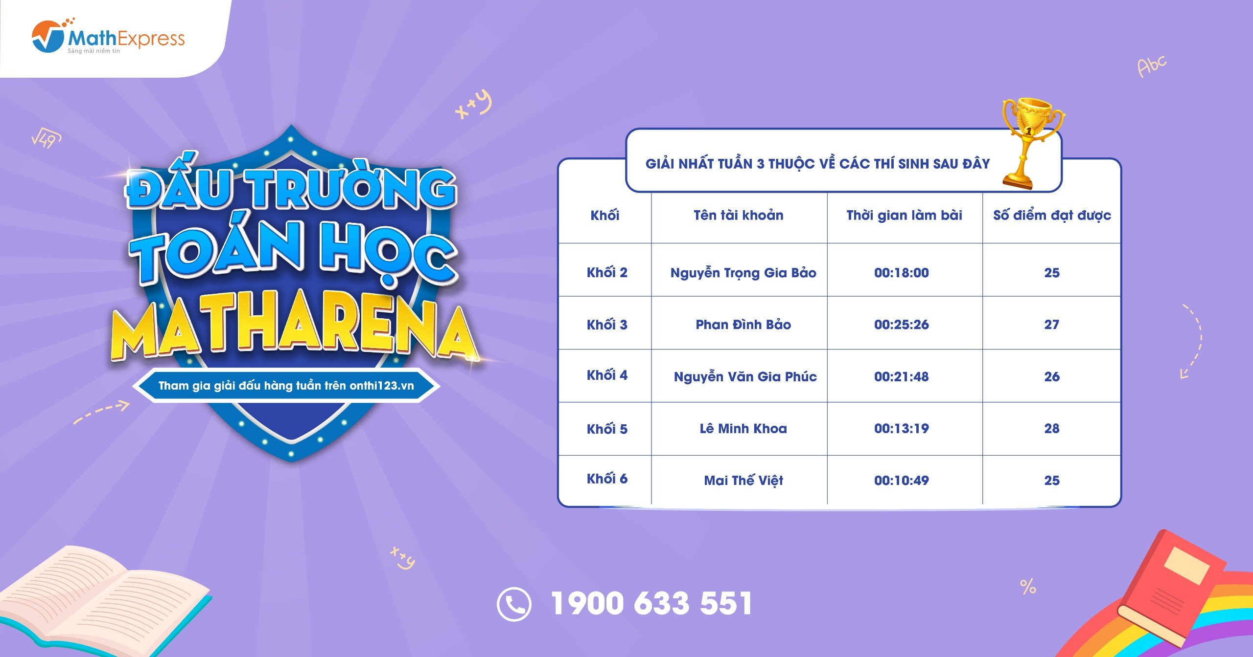 MathExpress xin chúc mừng các em đã chính thức sở hữu phần thưởng cho giải Nhất tuần: 1 thẻ VIP 1 tháng sử dụng onthi123. CLB sẽ sớm liên hệ với phụ huynh và các em để tiến hành trao giải. Đặc biệt, trong số 5 bạn ở trên, em Lê Minh Khoa là thí sinh duy nhất liên tiếp “soán ngôi” Nhất Tuần cả 3 trận từ lúc đấu trường MathArena tháng 05 khởi tranh. Việc kiên trì tham gia từng tuần và luôn duy trì được phong độ tốt của em thực sự rất đáng khen ngợi.