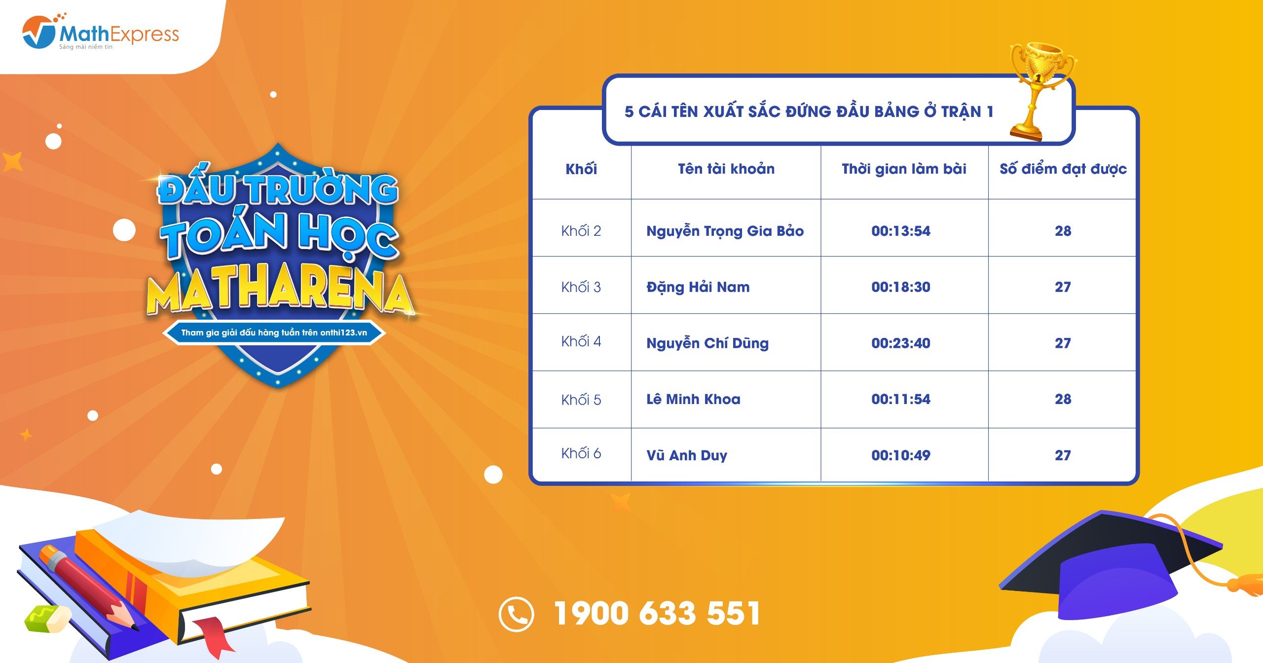 Tối thứ 7 ngày 06/04/2024 vừa qua, đấu trường Toán học – MathArena đã chứng kiến màn “đấu trí” thú vị của gần 100 học sinh đến từ khối 2 – 6 trong “chặng đua” đầu tiên của kỳ thi tháng 04/2024. Bài viết sau đây sẽ công bố 5 “chú sóc” đua Top thành công và giành vị trí đầu bảng của trận đấu này.