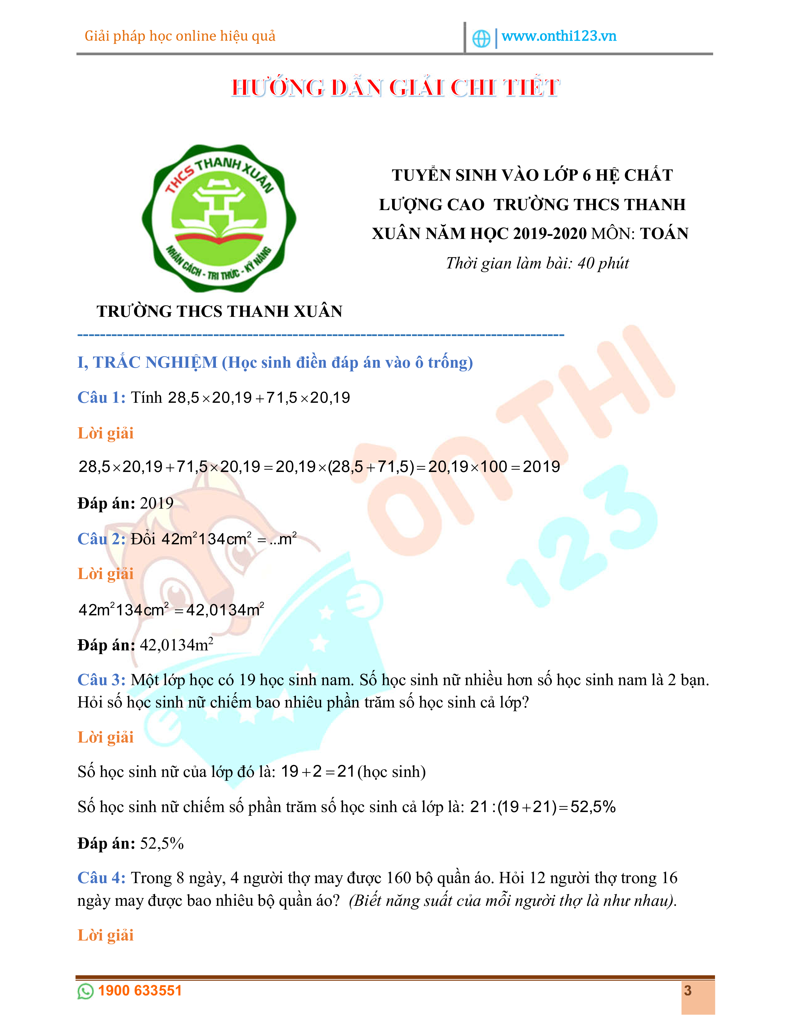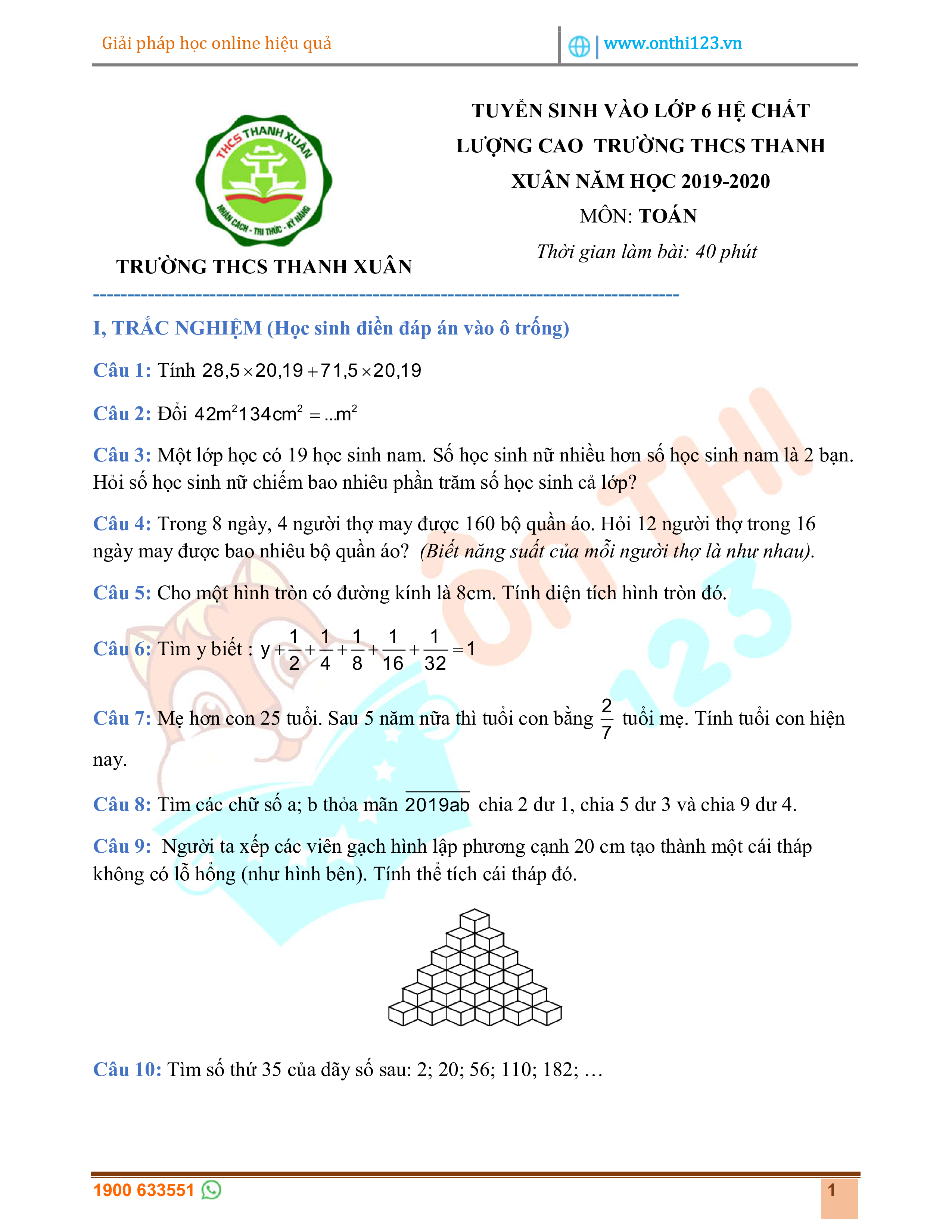 ĐỀ TUYỂN SINH VÀO LỚP 6 HỆ CHẤT LƯỢNG CAO TRƯỜNG THCS THANH XUÂN NĂM HỌC 2019-2020